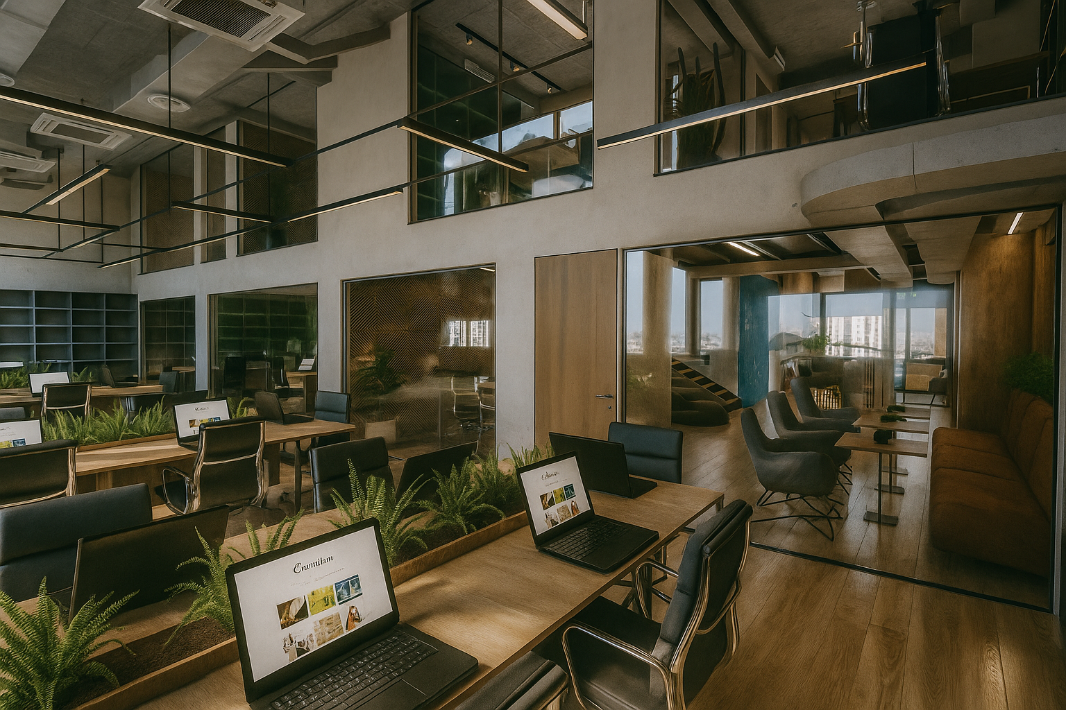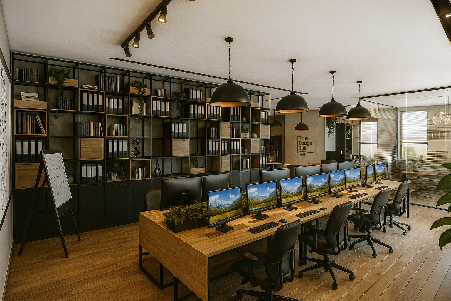 Besondere Highlights sind die veränderbare Beleuchtung für unterschiedliche Arbeitsstimmungen, mobile Möbel für flexible Raumkonfigurationen und ein begrünter Innenhof als Rückzugsort.